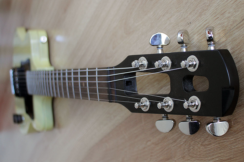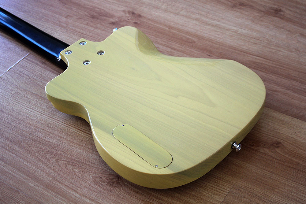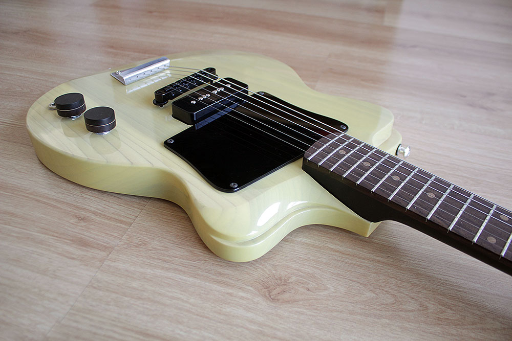 Cuerpo pequeño, y delgado de álamo de una sóla pieza, con una forma que facilita el acceso a los últimos trastes. Escala 25”.