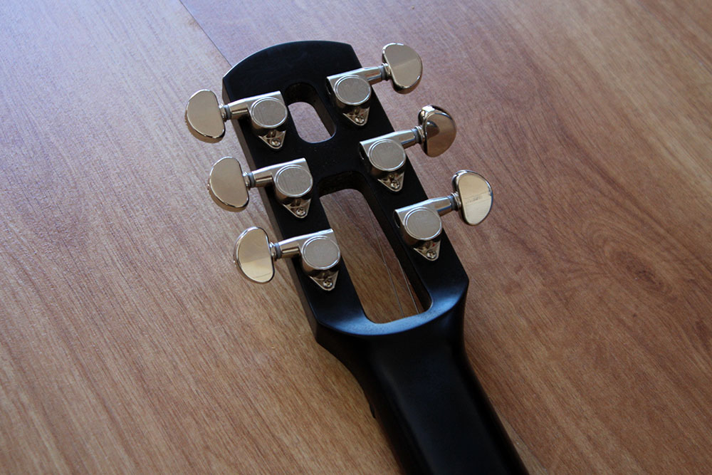 El mástil en éste modelo va atornillado al cuerpo, sobreelevado. En caoba, con diapasón de palosanto. Radio 12”.